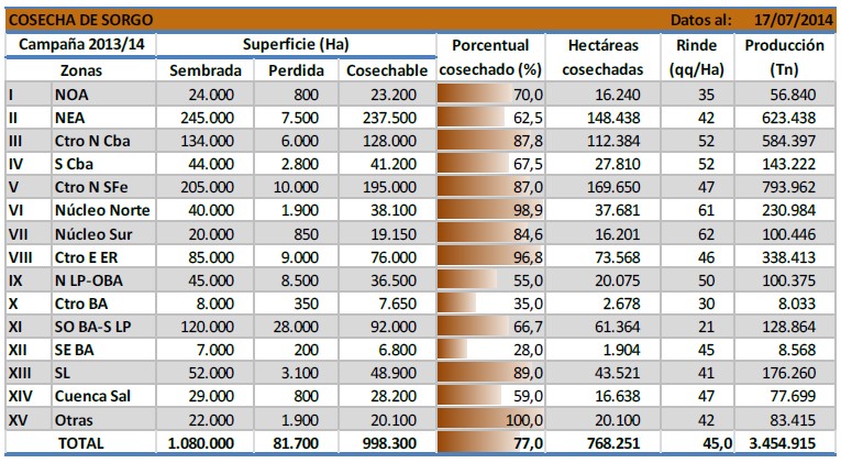 La cosecha de sorgo avanzó un 9,7 % durante los últimos 15 días, elevando la recolección nacional al 77 % del área apta y reflejando un retraso interanual de 16 puntos porcentuales. La principal causa de esta demora en la cosecha es la falta de piso en lotes y caminos. Al presente informe el rinde medio nacional es de 45 qq/Ha, lo cual con 770 mil hectáreas recolectadas permite acumular un volumen de 3,45 MTn.
