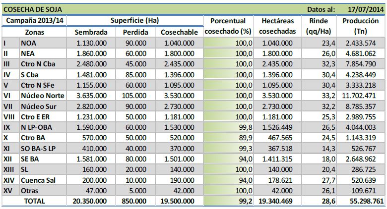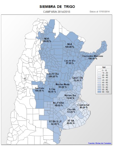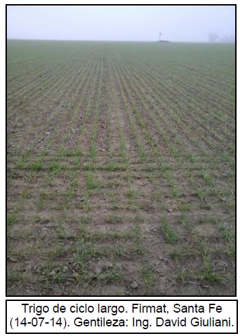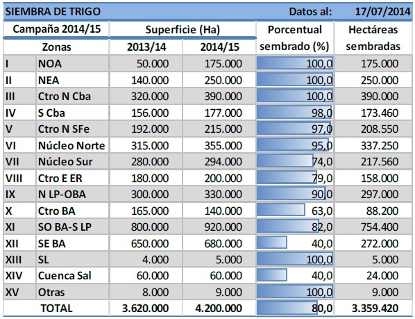 De este modo, estimamos que se implantarán 100 mil hectáreas menos que lo previsto al inicio de campaña, con lo cual a la fecha la nueva proyección es de (estimación 4.200.000 hectáreas hasta el 10/07/14: 4.3 MHa). En consecuencia, el incremento de superficie interanual ahora es del 16 %, entendiendo que en el anterior ciclo 2013/14 se cubrieron a nivel nacional 3.620.000 hectáreas. Cabe destacar que, de continuar el clima desfavorable para la siembra de trigo, la caída de área puede ser aún mayor, ya que algunas zonas como el este y sudeste de la provincia de Buenos Aires tienen alrededor de 25-30 días por delante para continuar con las tareas de implantación.