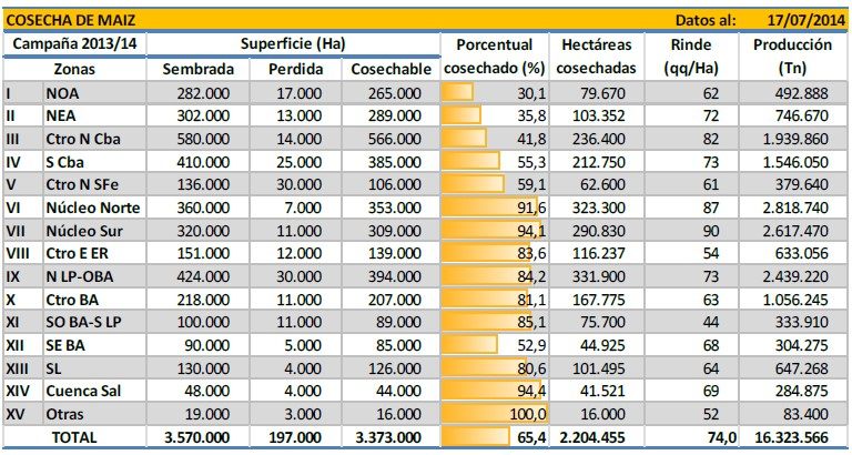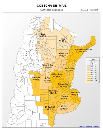 Este fuerte avance en la recolección de maíz se debe al progreso en zonas como el NOA, Córdoba y Norte de La Pampa-el Oeste de Buenos Aires. En estas regiones se están trillando lotes con mayor humedad en el grano de lo que exige el mercado (entre 16 y 18 % Hº).