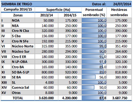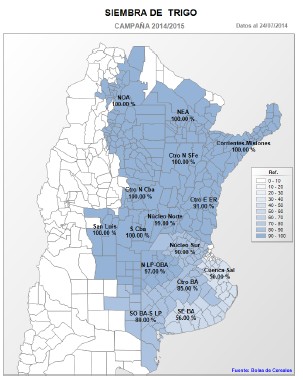A la fecha se sembró el 87,8 % de las 4.200.000 hectáreas estimadas para el presente ciclo, un 16 % más de lo implantado la campaña previa (2013/14: 3,62 MHa). Dicho progreso nos permite calcular un avance intersemanal de 7,8 puntos porcentuales y un retraso interanual de -4,9 %. En números absolutos la superficie cubierta asciende a 3,69 MHa, es decir que aún restan sembrarse unas 500 mHa a nivel país. De esta superficie remanente, el 58 % corresponde al sudeste bonaerense, y cerca del 10 % al centro y este de la misma provincia. En tanto un 20 % pertenece al Sudoeste de Buenos Aires y Sur de La Pampa, en donde no hay inconvenientes para poder implantar el área intencionada, el resto se distribuye en la franja central del área agrícola central.