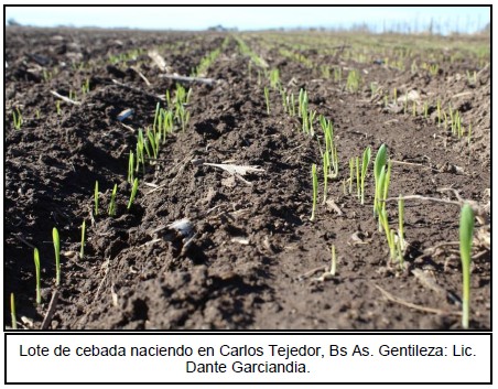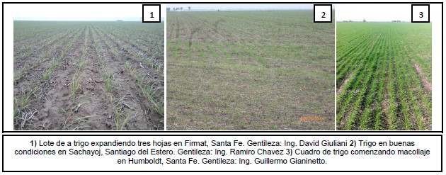 La región que dio por concluidas las labores de implantación en estas últimas semanas fue el Núcleo Norte, con una superficie estimada en 16 mil hectáreas. Los lotes más desarrollados en dicha región ya tienen 3 hojas expandidas en buenas condiciones. A diferencia de esto, su vecina región al Centro-Este de Entre Ríos presenta algunas fallas en la siembra por excesos hídricos. En el Núcleo Sur, y Norte de La Pampa-Oeste de Buenos Aires tienen un progreso acumulado próximo al 85 % de sus respectivas áreas y los primeros lotes implantados se encuentran en buenas condiciones con 2 hojas totalmente expandidas. Las regiones en donde los excesos hídricos están generando mayores demoras en la siembra son la Cuenca del Salado, el Centro y el Sudeste de Buenos Aires, con retrasos interanuales que en promedio rondan el 35 %. Estas zonas presentan fuertes inconvenientes y reflejan gran parte del ajuste de área realizado.