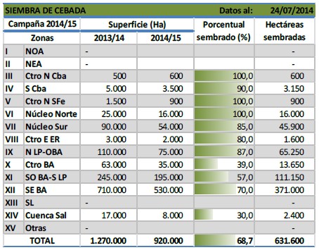 Las labores de implantación continúan con problemas debido a los excesos hídricos. Al haberse cumplido el pronóstico de abundantes precipitaciones para la región este y sudeste del área agrícola nacional, la siembra de cebada acumuló un retraso que a la fecha impacta negativamente sobre los planes de implantación. De este modo, debemos reducir la proyección de área a implantar en unas 130.000 Ha sobre lo previsto a inicio de campaña. Nuestra nueva estimación de superficie es de 920.000 hectáreas, cifra que refleja una caída del -12 % respecto a nuestra primera proyección al inicio del ciclo 2014/15 (al 10/07/2014: 1,05 MHa) y es un -28 % inferior a lo implantado en la campaña previa (campaña 2013/14: 1,27 MHa).