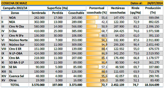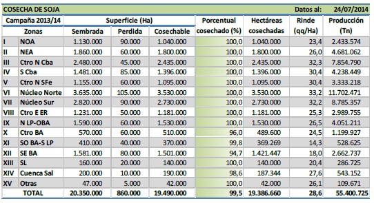 Solo restan recolectar 100.000 hectáreas para finalizar la campaña, superficie que en su totalidad se ubica en la región bonaerense. Al presente informe se incrementaron las pérdidas de lotes sobre el Centro de Buenos Aires, como consecuencia de los excesos hídricos acumulados en varios cuadros de la región. Pese a ello, la superficie abandonada no es significativa a nivel nacional y en consecuencia no afecta nuestra actual proyección de cosecha. Sobre el Sudeste de Buenos Aires se concentra la mayor parte del área aún en pie, y se espera que la recolección avance durante los próximos días en la región para poder dar por culminada la campaña 2013/14.