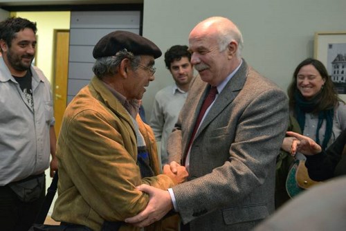 Casamiquela al saludar a uno de los productores presentes en la mesa de trabajo