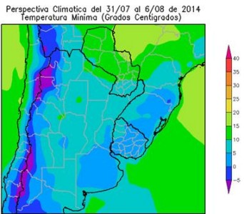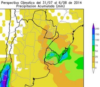 Paralelamente, se completará el paso del frente de tormenta, ingresado en los días precedentes, el cual producirá precipitaciones sobre el extremo oriental del área agrícola, mientras que la mayor parte del resto observará valores escasos. La Cordillera Sur, observará fuertes tormentas. Debido al escaso contenido de humedad y a la baja temperatura de la masa de aire polar que acompañará al frente, podrían producirse nevadas en el oeste y el sur de La Argentina. No obstante, es probable que la entrada de aire húmedo desde el Océano Atlántico reduzca considerablemente el área realmente cubierta por las posibles nevadas, pero es notable que se den condiciones propicias para este tipo de fenómenos. Hacia el final de la perspectiva, arribarán los vientos del sur, provocando un marcado descenso térmico, con riesgo de heladas generales en la mayor parte del oeste del área agrícola, y eventos localizados en el este.