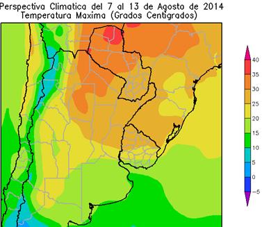 La mayor parte del área triguera, el sur del cinturón maicero, el norte del Delta y la mayor parte de la Región del Sudeste, observarán temperaturas máximas superiores a 30°C, con focos de más de 35 °C. El este del área triguera y el norte y el centro del cinturón maicero, experimentará temperaturas máximas inferiores a 30°C.