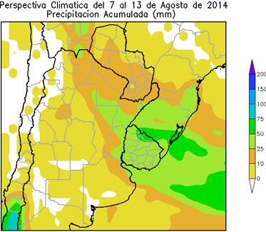 El sudeste y el sudoeste del Paraguay, el este del NOA, la Región del Chaco, la Mesopotamia, el este de la Región Pampeana y la mayor parte del Uruguay observarán precipitaciones moderadas a abundantes (10 a 50 mm). La mayor parte del área agrícola de argentina y el nordeste y el noroeste del Paraguay registrarán precipitaciones escasas (menos de 10 mm), observándose algunos focos con valores moderados (10 a 25 mm).