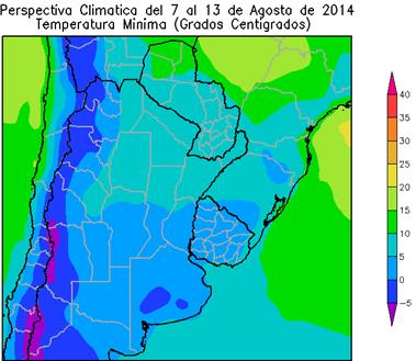 Hacia el final de la primera etapa de la perspectiva, arribarán los vientos del sur, provocando un marcado descenso térmico, con riesgo de heladas generales en la mayor parte del oeste del área agrícola, y eventos localizados en el este. Sólo la mayor parte del Paraguay y la mayor parte de Formosa, observará temperaturas mínimas superiores a 10ºC.