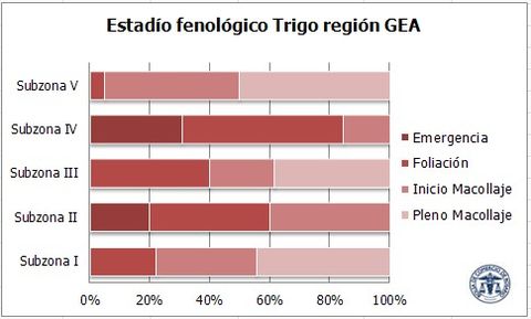 Los lotes de trigo muestras condiciones muy buenas a excelentes. Los estadios fenológicos varían ampliamente según zona (ver gráfico). Al noroeste de la provincia de Buenos Aires todavía se mantienen en emergencia y foliación. En contraposición, el este cordobés prácticamente totaliza lotes en inicios a pleno macollaje y confirma el aumento de área del 20%. Los barbechos fueron bien realizados y, por el momento, le ganan la batalla a la rama negra, la maleza más temida.