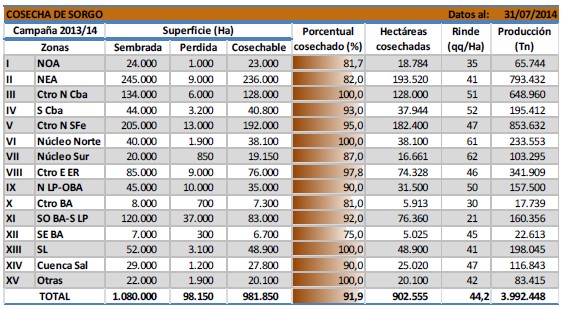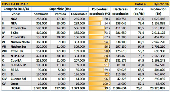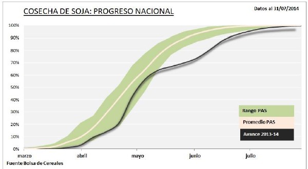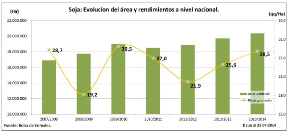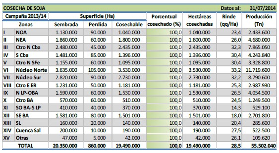 Se da por finalizada la campaña de soja 2013/14. Luego de cosecharse una superficie récord, levemente inferior a las 19,5 MHa, el rinde medio nacional descendió a 28,5 qq/Ha y la producción finalmente alcanzó las , cifra también récord al superar la producción de 55 MTn logradas durante la campaña 2009/10. 55.500.000 toneladas. Las pérdidas de área estimadas al cierre del ciclo alcanzan las 860.000 hectáreas, número que equivale al 4,2 % de la superficie sembrada y que supera ampliamente los porcentajes de pérdidas registrados durante las últimas cuatro campañas.