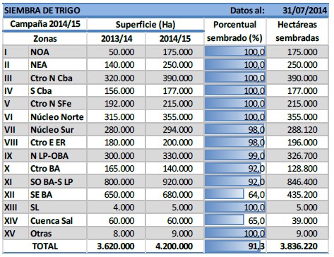 Las tareas de siembra de trigo se concentran en el sur del área agrícola nacional, en donde aún se registran problemas hídricos. De este modo, un 76 % de la superficie pendiente se encuentra con inconvenientes por excesos de humedad en el Centro, Este y Sudeste bonaerense, con lo cual se mantiene la incertidumbre de cubrir dicha área.