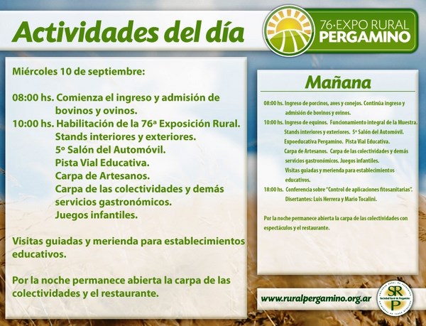 Hoy a las 8:00 comienza el ingreso y admisión de bovinos y ovinos. A las 10:00 la habilitación de la 76ª Exposición Rural de Pergamino. Stands interiores y exteriores y 5º Salón del Automóvil. Expoeducativa Pergamino. Pista Vial Educativa. Carpa de Artesanos. Carpa de las colectividades y demás servicios gastronómicos. Juegos infantiles. Visitas guiadas y merienda para establecimientos educativos. Por la noche permanece abierta la carpa de las colectividades y el restaurante.