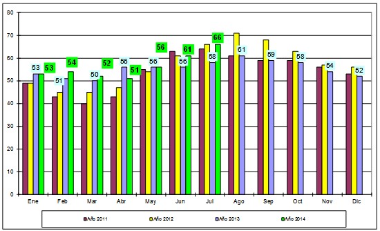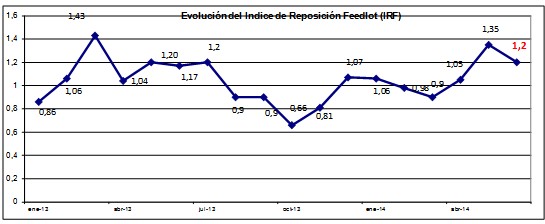 La ocupación de los feedlots sigue creciendo de acuerdo a lo esperado. Junio logró el 61% y en julio se alcanzó el 66 %. El IRF (Índice Reposición Feedlot) está en torno al 1.2. Si bien seguimos con tendencia al llenado, el ritmo es menor que el observado durante los meses otoñales.
