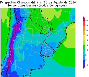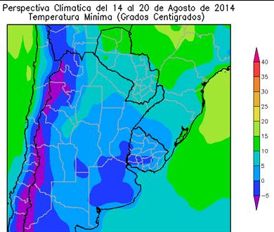 Sólo el noroeste del Paraguay observará temperaturas mínimas superiores a 10°C. El este del NOA, el norte de la Mesopotamia, el norte de Córdoba, la mayor parte de la Región del Chaco, el nordeste de Córdoba y el este del Uruguay, observará temperaturas mínimas entre 5 y 10ºC, con leve riesgo de helada localizadas. El centro-este del NOA, la mayor parte de Cuyo, el sur de la Región del Chaco, la mayor parte de Corrientes, de Santa Fe, la mayor parte de la Región Pampeana y la mayor parte del Uruguay, observarán temperaturas mínimas entre 0 y 5 ºC, con riesgo de heladas localizadas.