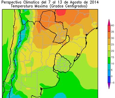 El este del área triguera, ´la mayor parte del cinturón maicero y el nordeste de la Región del Sudeste, observarán temperaturas máximas superiores a 25°C. La mayor parte del área triguera, el sur del cinturón maicero, el nordeste del Delta y el norte y el sur de la Región del Sudeste, experimentará temperaturas máximas superiores a 30°C, con focos con temperaturas superiores a 35ºC. El sur del área triguera, la mayor parte del Delta y el centro de la Región del Sudeste, registrarán temperaturas máximas superiores a 35ºC, con focos superiores a 40ºC.