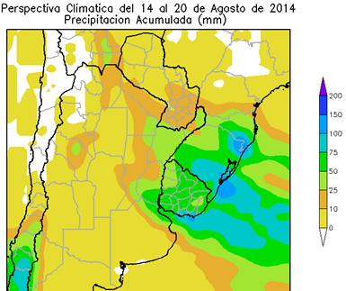 La mayor parte del área agrícola paraguaya, la mayor parte del área agrícola uruguaya y la mayor parte del área agrícola argentina, observará precipitaciones escasas (menos de 10 mm). El centro-norte del NOA, el sur de la Región del Chaco, el norte y el centro de la Mesopotamia y el noroeste del Uruguay observarán precipitaciones moderadas (10 a 25 mm) con focos de valores abundantes (más de 25 mm).