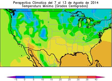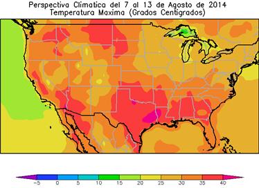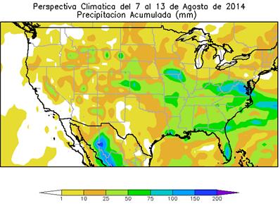La perspectiva comenzará con el paso de un frente de tormenta, que producirá lluvias de variada intensidad sobre la mayor parte del área agrícola norteamericana, aunque con valores muy dispares. El paso del frente aportará una masa de aire frío, que provocará un marcado descenso de la temperatura. Entre mediados y finales de la perspectiva, retornarán los vientos del sur, provocando un marcado ascenso de la temperatura, que dará inicio a un periodo prolongado de calor excesivo, estimulando la demanda de riego y estrés a los cultivos reproductivos de verano. Este proceso incluirá algunos fenómenos extemporáneos: 8 al 9 de Agosto: fuertes lluvias desde el Valle de Tennessee a las Carolinas; 10 al 11 de Agosto: Fuertes lluvias cercas de las costas sur del Atlántico, partes de Georgia y la Región del Panhandle de Florida; Sequía severa para las Grandes Planicies, el Sudoeste, el Noroeste del Pacífico, la Gran Cuenca y California.