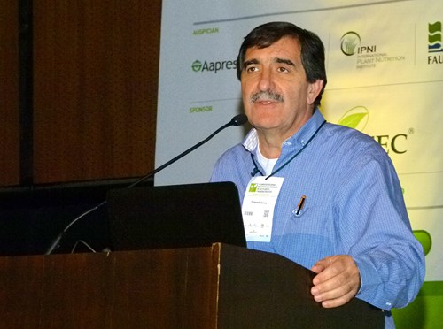 En primer lugar, el Prof. Dr. Godofredo Cesar Vitti, de Esalq/USP (Brasil) destacó la importancia de los micronutrientes en el crecimiento, desarrollo y calidad de las plantas, y su papel en la resistencia a estrés, plagas y enfermedades. Analizó las fuentes y el manejo de los micronutrientes, las formas de absorción foliar y por las raíces y su comportamiento en el cultivo. Enfatizó que “la planta no come, bebe”, por lo que es imprescindible que los micronutrientes estén disponibles en el agua del suelo y que tengan una solubilidad de al menos un 60%. Recomendó tener en cuenta para el aporte de micronutrientes la exigencia de cada cultivo, las deficiencias del suelo (para lo cual es necesario realizar una análisis sólo en la capa superficial) y un buen diagnóstico foliar en trigo y maíz. Respecto a las vías de aplicación, recomendó, en suelo y para soja: boro, cobre y zinc –oxisulfatos y ulexitas- mientras que para maíz la sugerencia es zinc y boro. Por vía foliar es conveniente aplicar sales y quelatos, haciendo mención especial a la aplicación de sulfato de magnesio en cultivos expuestos a altas temperaturas. Por último, mencionó la aplicación de micronutrientes junto con herbicidas y como tratamiento de semillas. En su reflexión final, el Dr. Vitti sugirió que “Solamente alimentando las plantas, será posible alimentar al hombre”.
