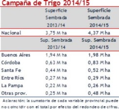 En términos interanuales el área triguera crecería en un 16,5% a escala nacional si bien los guarismos de superficie del trigo 2014/2015 deberán seguir siendo revisados y ver si finalmente se cumplen los planes de siembra en el sudeste bonaerense.