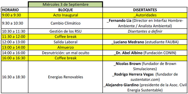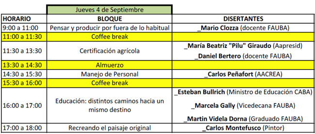 - Sustentabilidad: ser eficiente teniendo al ambiente como prioridad - AgriCultura y Ambiente: ¿estamos yendo hacia donde deberíamos ir? - Manejo de adversidades bajo siembra directa: problematica actual y futuro - Energías renovables - Compromiso social: la importancia de la participación para generar cambios - Perspectivas de la agroindustria - ¿Hacia dónde va la economía? - Jóvenes emprendedores: la autogeneración de oportunidades - Política: el futuro de la producción agropecuaria argentina