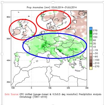 Francia comenzó a cosechar tímidamente el trigo en el sur a principios de julio para luego reforzar la trilla en el centro y norte del país alrededor de la fiesta nacional du 14 juillet. Al día de hoy se lleva cosechado el 92% del área, estimándose un volumen de producción cercano a 38 Mot, próximo del record histórico de 1998/99. Sucede que Francia también bate record este año, esta vez, en una de las peores cosechas en materia de calidad que tuvo el país galo en estos últimos 20 años. Se estima que alrededor de dos tercios de la colecta de trigo en Francia no supera los 150s de falling number, precisando que tanto la industria local como la demanda internacional exigen un mínimo de 220s. Esta fuerte caída del falling que hasta pone en riesgo el correcto funcionamiento del mercado a término europeo, se debe al hecho que durante todo el mes de julio no ha parado de llover en buena parte de Europa del oeste, a excepción de los países nórdicos y del Reino Unido.