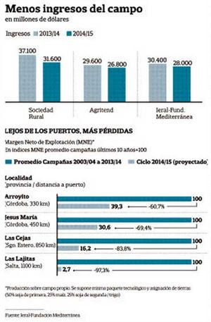 Por su parte, Ambrosetti calcula que la cosecha 2014/15 puede llegar a rozar los 99 millones de toneladas, lo que significaría "unos 4,5 millones de toneladas menos" que la actual campaña. "El precio de los insumos ha subido y el valor de los productos ha bajado: pésima combinación para obtener rentabilidad", explica el economista de la Sociedad Rural. Mientras tanto, la presión impositiva, vía retenciones a la exportación, se mantiene constante. Según Ambrosetti, los ingresos por retenciones caerían el año próximo unos 1500 millones de dólares, "que hoy equivalen al 15% de las reservas del BCRA".