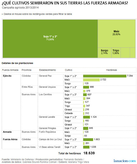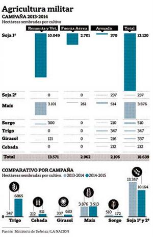 En la última campaña, 2013/2014, las Fuerzas Armadas sembraron con soja casi 72% (exactamente 71,66%) del área bajo cultivo en campos de su propiedad. Fueron 13.357 hectáreas, sobre un total cultivado de 18.639 hectáreas en tierras que esas fuerzas tienen en Buenos Aires, Córdoba y Entre Ríos.