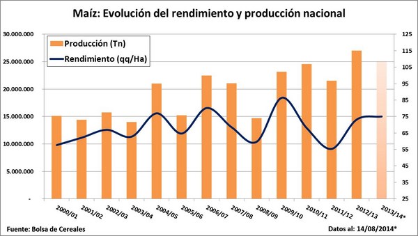 Durante la campaña 2013/14 se logró cubrir una superficie de 3,57 MHa a nivel nacional, cifra que también reflejó una caída del -10 % en comparación al ciclo 2012/13. Sobre dicha área sembrada y teniendo en cuenta que su recolección aún no ha finalizado, la producción esperada se estima en 25.000.000 de toneladas. De concretarse este volumen, sería la segunda mejor producción registrada en Argentina durante los últimos 13 años, únicamente superada por la campaña previa 2012/13, en donde se había alcanzado el récord de 27 MTn a nivel nacional.