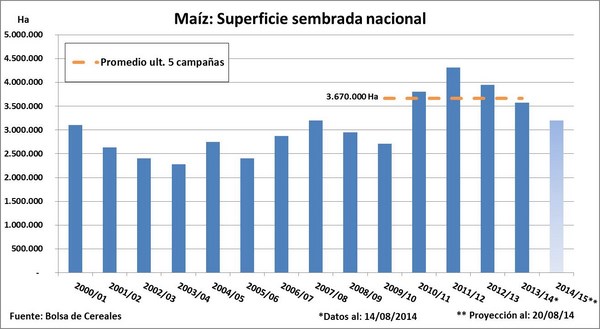 Finalizado el relevamiento sobre la intención de siembra para este nuevo ciclo, el común denominador es la incertidumbre sobre el área que los productores destinarán al cultivo en cada una de las quince regiones bajo estudio. Pese a ello, los resultados obtenidos permiten anticipar una reducción de superficie implantada con maíz, la que podría alcanzar un máximo de 3.200.000 hectáreas durante la nueva campaña. Esta cifra podría sufrir modificaciones a lo largo del período de siembra, pero de concretarse representaría un recorte superior al -10 % en comparación a la campaña previa (2013/14: 3,57 MHa), y equivaldría a la tercera caída de área consecutiva desde el ciclo 2011/12.