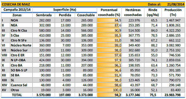 Frente a este escenario mantenemos nuestra proyección de producción en 25.000.000 toneladas para fin de campaña. Este volumen, de lograrse, se encontraría un -7,4 % por debajo de lo cosechado la zafra pasada (2012/13: 27 MTn).