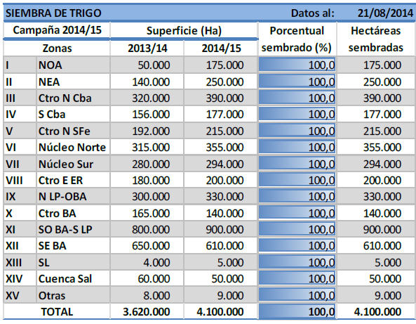 Bajo este escenario, el incremento interanual de área que estamos registrando (+480.000 vs campaña 2013/14) se debe a la expansión del área triguera en amplios sectores del centro y norte de la región agrícola, como así también sobre La Pampa, el Oeste y Sudoeste de Buenos Aires. En paralelo, en el Centro, Sur y Este bonaerense, zonas fuertemente afectadas por las lluvias, se registraron mermas de superficie en comparación al ciclo previo.