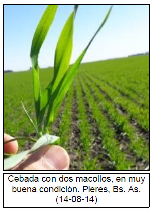 Dentro de las regiones que finalizaron su siembra en los últimos días, se encuentran las dos zonas que componen el principal núcleo cebadero nacional (Sudeste, Sudoeste de Buenos Aires y Sur de La Pampa). Estas regiones ostentan cerca del 80 % de la superficie nacional implantada con cebada y para la presente campaña cerraron su siembra con reducciones interanuales de área del orden del 20 % para el Sudoeste de Buenos Aires y Sur de La Pampa, y del 25 % para el Sudeste de Buenos Aires. Al margen de esto, los lotes sembrados en estas zonas se encuentran en estados que van desde emergencia hasta macollaje, en condiciones de regular a buena.
