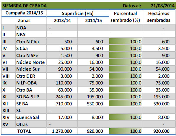 Durante los últimos quince días se sembraron lotes pendientes en la Cuenca del Salado, Sudoeste de Buenos Aires y Sur de La Pampa, Centro y Sudeste de Buenos Aires, con lo cual dimos por finalizada la siembra de cebada a nivel nacional. Esta campaña estuvo marcada por importantes problemas de suelos saturados en lotes y caminos. En cuanto a la superficie sembrada, la estimación se mantiene en 920.000 hectáreas para la campaña en curso, dicha superficie es un - 28 % inferior a lo sembrado durante la campaña 2013/14 e incluso se encuentra por debajo del promedio de área implantada durante las últimas 5 campañas. El progreso quincenal fue de un 12,1 % y aún pueden implantarse algunos lotes aislados hacia el sur de Buenos Aires.