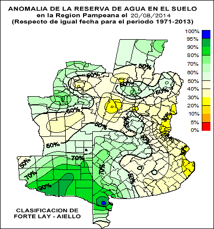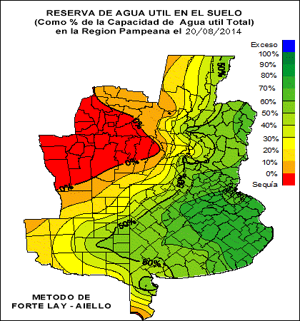 RESERVA DE AGUA ÚTIL EN EL SUELO (como % de la capacidad de agua útil total) en la Región Pampeana el 20 de Agosto de 2014