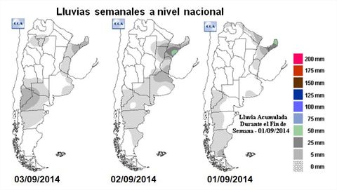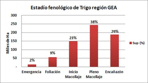 Los lotes de trigo comienzan a sentir la falta de precipitaciones y muestran el daño que dejaron las heladas. Están en buen estado pero con hojas de tonalidades amarillas. La deficiencia de agua en los niveles superficiales del suelo dificulta la translocación del nitrógeno y contribuye a la pérdida de hojas basales y al amarillamiento. Luego de días con altísimas temperaturas, y ante la falta de rustificación de los tejidos foliares, el cambio abrupto de temperaturas agravó el impacto de las heladas sobre los lotes. Se observan puntas de hojas quemadas y crecimiento paralizado. Sin embargo, el nivel de daño varía según la susceptibilidad del cultivar a la helada, el relieve (los bajos fueron más afectados) y la cantidad de rastrojo en superficie. Comienzan a presentarse enfermedades en el trigo; hay cuadros con síntomas de mancha amarilla y pústulas de roya en materiales susceptibles. Sin embargo, por ahora no se justifican medidas de control. El grueso de la superficie triguera está atravesando los estadios vegetativos de macollaje (38%) y encañazón (29%). Con las nuevas lluvias se espera una recuperación del cultivo. Las precipitaciones comenzarán a desarrollarse desde las primeras horas de hoy, (04/09), y se mantendrían hasta el sábado.