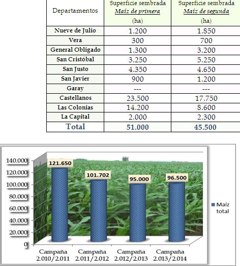 La superficie sembrada con maíz en la campaña 2013/2014 fue 1,58% superior a la del ciclo agrícola anterior, que fue de 95.000 hectáreas. El SEA analiza el desenvolvimientos de los cultivos en 10 departamentos: La Capital, Las Colonias, Castellanos, San Justo, San Cristóbal, Garay, San Javier, 9 de Julio, Vera y General López.