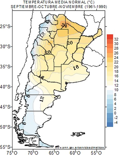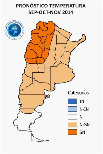 TEMPERATURA: Para este trimestre se espera que la temperatura media sea superior a la normal sobre el Noroeste argentino y norte de Cuyo. En el resto del centro y norte del país y sobre el centro y norte de la Patagonia se espera que la temperatura media sea normal o superior a la normal. Sobre el sur de la Patagonia la temperatura sería próxima a lo normalmente esperado para el trimestre