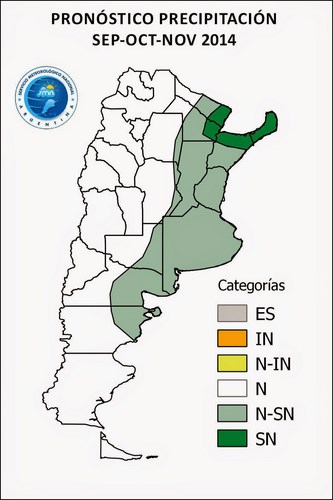 Para este trimestre se espera que la precipitación sea superior a la normal sobre el noreste del país, abarcado Misiones, norte de Corrientes, este de Chaco y este de Formosa; precipitaciones normales o superiores a las normales se esperan en el centro y sur del Litoral, centro de Formosa, centro de chaco, este de Córdoba, provincias de Santa Fe, Buenos Aires, este de La Pampa y noreste de la Patagonia. En el resto del país se esperan precipitaciones próximas a lo normal.