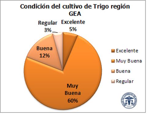 El trigo evoluciona bajo muy buenas condiciones. El 65% de los cuadros está en encañazón y se encuentran en muy buen estado. Los lotes cordobeses son los más avanzados en fenología. Allí se visualiza la hoja bandera en un 10% de los cuadros. Hacia el norte de esa provincia se requiere de agua; por eso califican al 12% de los lotes bajo condición regular. Las enfermedades siguen bajo la lupa: roya anaranjada, mancha amarilla y bacteriosis.