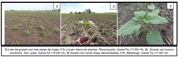 La región del NEA presenta una condición hídrica desfavorable, por lo que los productores se vieron obligados a culminar con las labores de implantación sin lograr completar el área proyectada a comienzo de campaña. Al mismo tiempo, la falta de humedad en el perfil afecta directamente en el estado general de los cuadros sembrados. Los lotes de girasol se encuentran diferenciando hojas, los más avanzados con hasta 6 pares de hojas expandidas, en una condición de regular a mala.