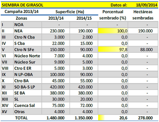 A la fecha se da por finalizada la siembra de girasol en la región NEA, y a nivel nacional ya se logró cubrir el 20,6 % del área proyectada en 1.350.000 hectáreas. En números absolutos ya se implantaron 278.000 hectáreas en toda la región agrícola, reflejando un avance intersemanal de 2,4 puntos porcentuales, y al mismo tiempo se registra un adelanto interanual de 1,7 %.