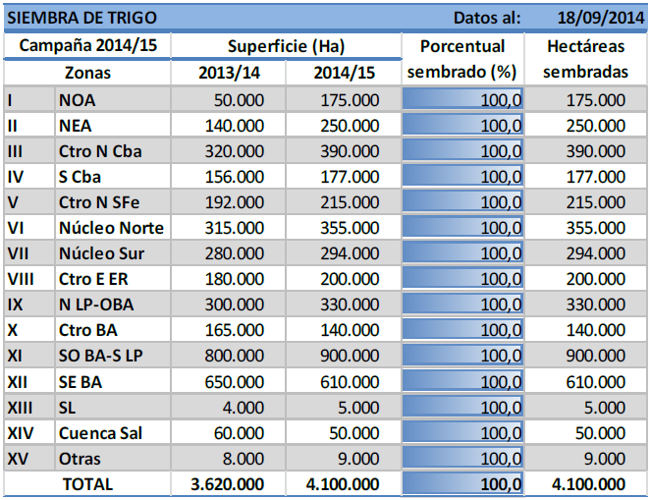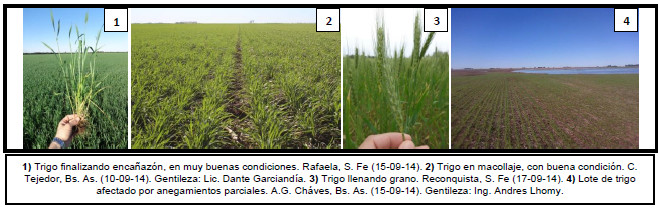 En la región bonaerense, pocos cuadros aún se encuentran diferenciando hojas hacia el sur de la provincia; mientras que hacia el norte de la misma, ya comienzan a encañar en buenas condiciones. El margen oeste es el que mejor estado de cultivo presenta, por haber recibido lluvias en general de menor caudal durante las últimas semanas.