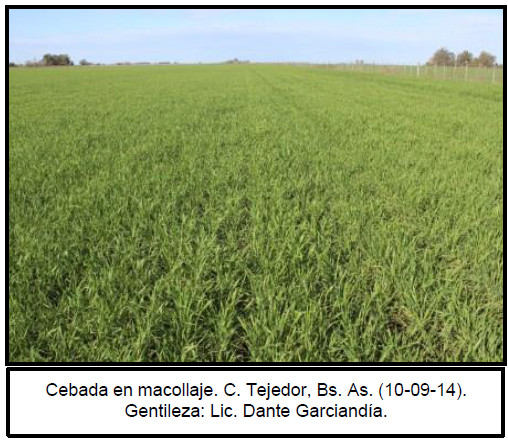 Distinto es el panorama de los lotes hacia el Sudoeste de Buenos Aires y Sur de La Pampa. En esta región los cuadros de cebada se encuentran en un muy buen estado, favorecidos por la disponibilidad hídrica de la región. En esta zona la siembra de cebada se extendió mucho en el tiempo, incorporando muchos cuadros sobre el cierre de la ventana óptima de siembra. Debido a ello, los lotes más avanzados se encuentren en macollaje, mientras que muchos otros continúan diferenciando hojas. El buen estado general del cultivo alienta a los productores a refertilizar gran parte de los cuadros.