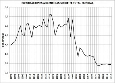 El gráfico 1 muestra la evolución de las exportaciones argentinas como porcentaje del total de las exportaciones mundiales durante los últimos 113 años. El gráfico es lo suficientemente elocuente y podemos ver que durante todo el período k las exportaciones argentinas siempre se mantuvieron en el 0,4% del total de las exportaciones mundiales.