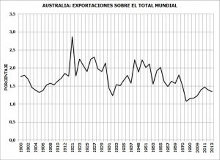 Si Argentina hubiese mantenido esa participación en el comercio mundial como lo hizo, por ejemplo, Australia, que se mantuvo entre el 1,5% y el 2% a lo largo de los 113 años considerados, hoy Argentina tendría que estar exportando unos U$S 375.000 millones anuales en vez de los U$S 81.600 millones de 2013, que encima son falsos porque el INDEC terminó reconociéndole a la CEPAL U$S 5.000 millones menos de lo que informa internamente.