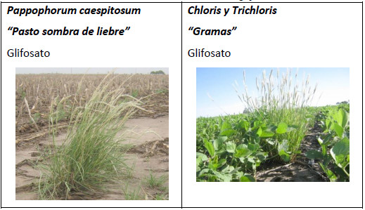 Simultáneamente, al considerar la problemática de gramíneas de difícil control, se deben tener en cuenta las malezas gramíneas tolerantes a glifosato que se encuentran en expansión y también dificultan el manejo de los sistemas productivos. En este grupo encontramos especies como Pappophorum caespitosum (perenne) y otras de los géneros Chloris (anuales y perennes) y Trichloris (perennes) (Tabla II).