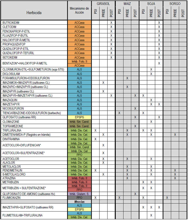 En la tabla III se presentan los herbicidas registrados en Argentina para control de gramíneas, según los cultivos estivales en los que pueden usarse y los momentos de uso.