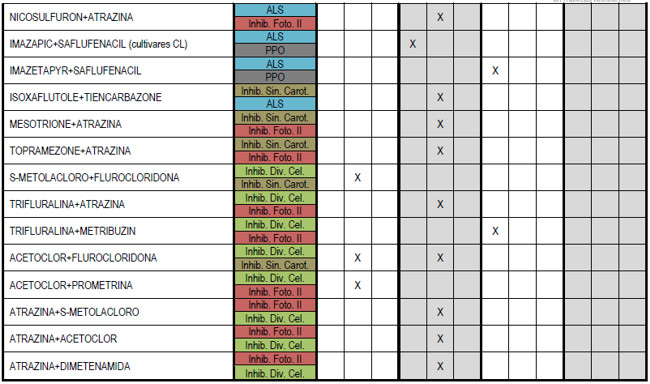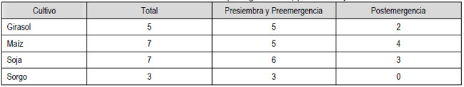 En total se dispone de 8 mecanismos de acción, lo que permite rotarlos. Para maíz se dispone de 7, para soja de 7, para girasol de 5 y para sorgo de 3 (Tabla IV). Pero contando los selectivos que puede usarse en postemergencia del cultivo, las opciones se restringen a 4 para maíz, 3 para soja, 2 para girasol y ninguna para sorgo.