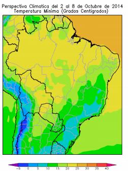 La mayor parte del Paraguay, el este del NOA y la mayor parte de la Región del Chaco, observarán temperaturas mínimas superiores a 15°C. Observándose un foco cálido con temperaturas máximas superiores a 20ºC, sobre el noroeste del Paraguay. El centro del NOA, la mayor parte de Cuyo, el sur de la Región del Chaco, la mayor parte de Córdoba, de Santa Fe, de la Mesopotamia, de La Pampa, el sudeste del Paraguay y el noroeste del Uruguay observarán temperaturas mínimas entre 10 y 15ºC.