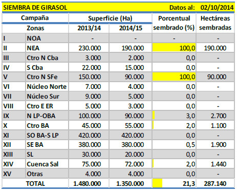 Habiéndose dado por finalizada las tareas de cobertura en el Centro-Norte de Santa Fe y comenzando con la siembra en el oeste y centro de Buenos Aires, como así también en lotes puntuales del Sudeste bonaerense, el avance nacional alcanza el 21,3 % del área apta proyectada para esta campaña en 1.350.000 hectáreas. De esta manera, se registra un progreso intersemanal de tan sólo de 0,5 puntos porcentuales y un retraso interanual de -2,2 puntos.